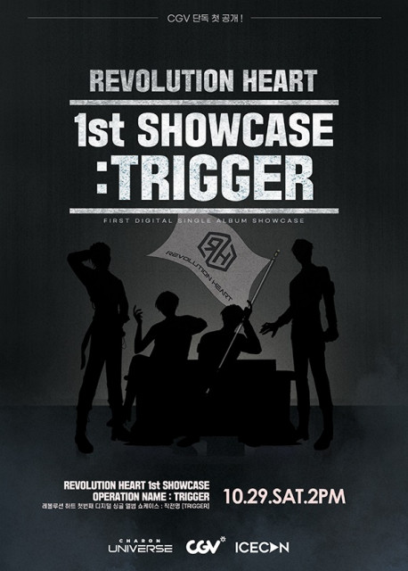 레볼루션 하트의 쇼케이스 ‘REVOLUTION HEART 1ST SHOWCASE: TRIGGER (혁명의 시작)’은 10월 29일 오후 2시 CGV용산아이파크몰, 왕십리, 영등포 등 3개 극장에서 진행된다. CGV왕십리에서는 카론 유니버스의 신예지 대표이사가 레볼루션 하트의 앨범 소개 및 향후 계획을 발표할 예정이라 1시 50분에 시작한다.