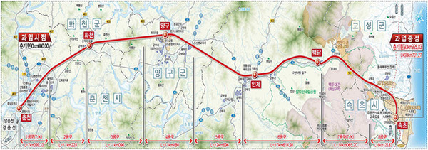 동서고속화철도는 서울에서 춘천까지 연결된 철로를 속초까지 연장하는 노선이다. 6년간 93.7km의 철도를 신설하며 화천·양구·인제·백담·속초 5개 정거장을 만든다. 사업비 총 2조 44377억원이 투입될 예정이다.