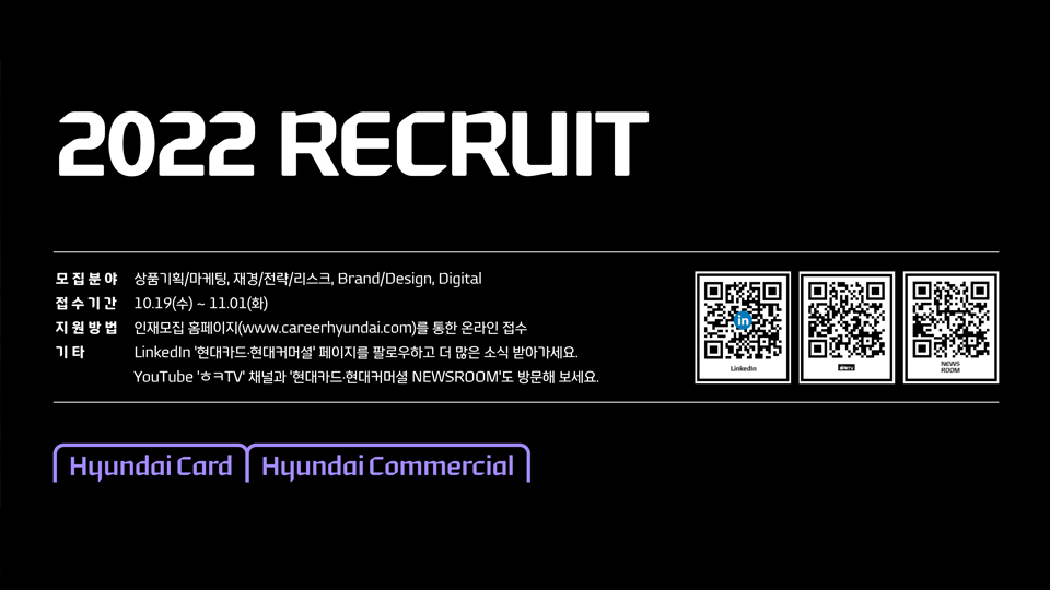 국내 대표적인 금융테크 기업 현대카드와 국내 산업금융 시장을 이끌고 있는 현대커머셜이 ‘2022 신입사원 공개 모집’을 실시한다고 19일 밝혔다.