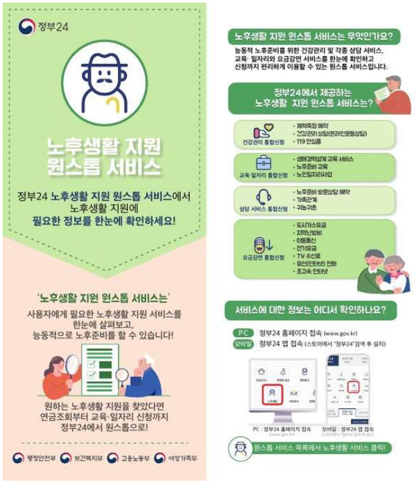 ‘노후생활지원 서비스’는 노후 준비에 필요한 의료·건강 등을 체계적으로 준비할 수 있도록 지원하는 서비스로, 대상·연령별로 정부 지원 혜택을 일괄 안내하고 의료·취업 등 핵심 서비스는 통합신청 할 수 있다.