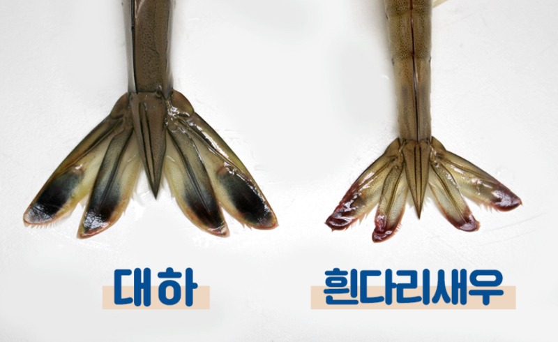 대하와 흰다리새우 구별법으로 가장 정확한 방법은 꼬리지느러미 색을 확인하는 방법이다. 자연산 대하의 경우 꼬리지느러미가 초록빛을 띄지만, 흰다리새우는 붉은빛을 띈다.