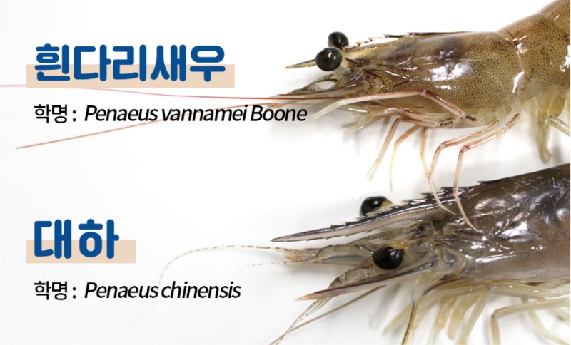 반면 흰다리새우는 코 끝이 짧고 더듬이도 대하보다 짧다. 수염의 길이도 몸길이와 비슷하며 다리는 투명한 듯한 흰색을 띠고 있다.