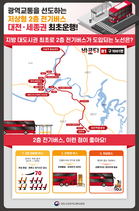 국토교통부 대도시권광역교통위원회(대광위)는 다음달 14일부터 2층 전기버스 2대를 대전역에서 세종시를 거쳐 오송역까지 운행하는 B1 노선(구 1001번)에서 운행을 개시한다고 24일 밝혔다.