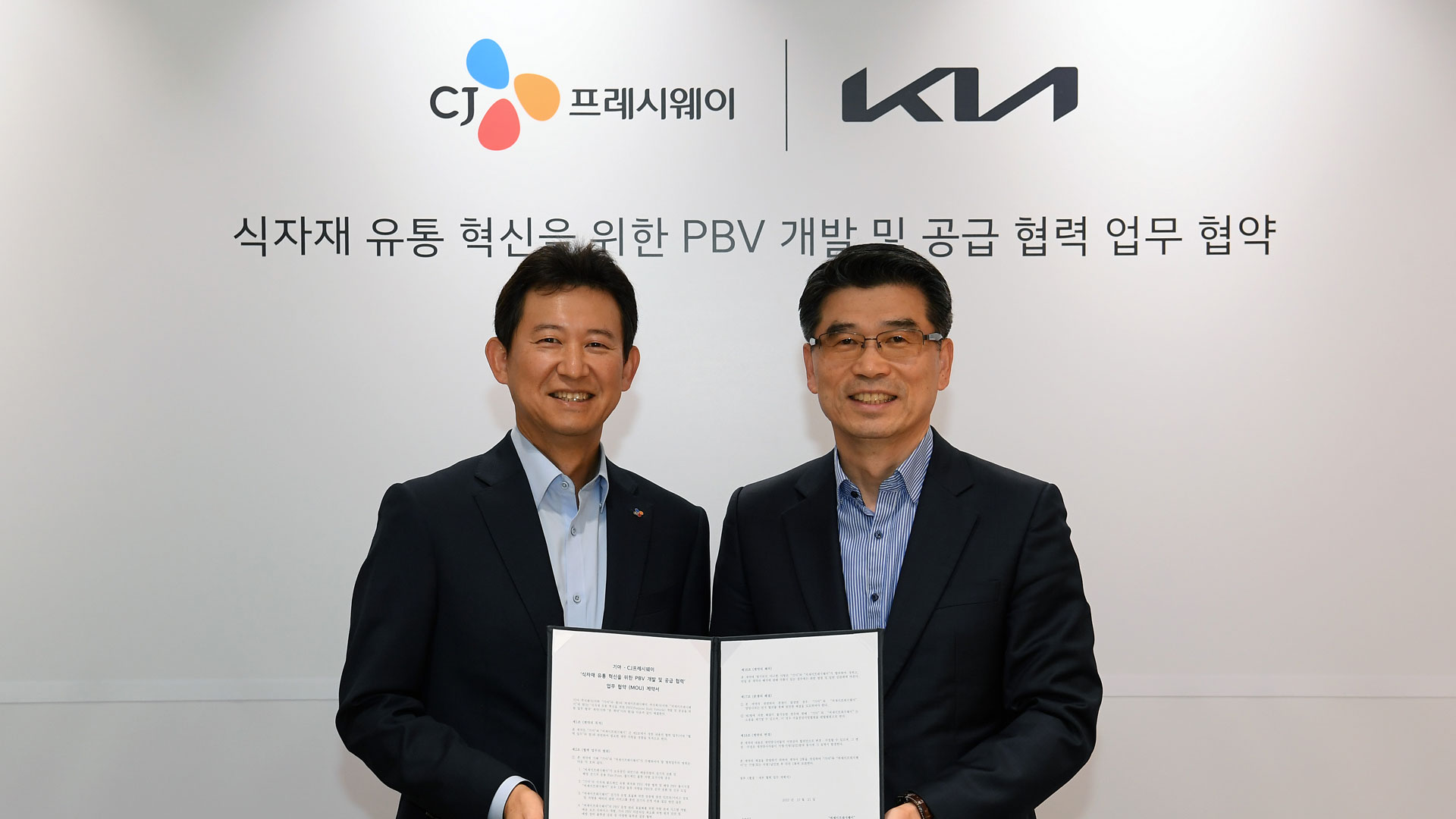 기아는 21일(금) 양재동 본사에서 기아 송호성 사장, CJ프레시웨이 정성필 대표이사, 기아 김상대 eLCV비즈니스사업부장, CJ프레시웨이 김진중 유통사업본부장 등 주요 관계자들이 참석한 가운데 CJ프레시웨이와 ‘식자재 유통 혁신을 위한 PBV 개발 및 공급 협력 업무협약(MOU)’을 체결했다.