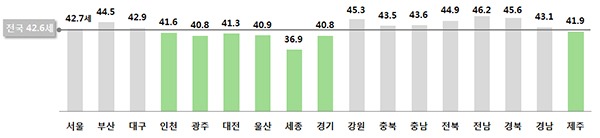 한편 주민등록 인구의 평균연령은 42.6세로, 평균연령보다 낮은 지역은 세종(36.9세), 광주·경기(40.8세), 울산(40.9세), 대전(41.3세) 등 7개 시·도다.