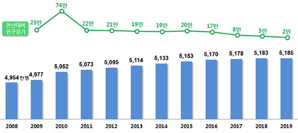 2019년말 우리나라 주민등록 인구는 5184만 9861명으로, 2018년말 5182만 6059명에 비해 2만 3802명이 늘었다.