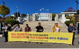 춘천 중도유적 지킴이들과 사회각계각층 시민단체들은 10월 25일 화요일 오후 3시 강원도청 앞에서 ‘중도유적지를 국가가 인수하라’를 주장하는 기자회견을 열었다.