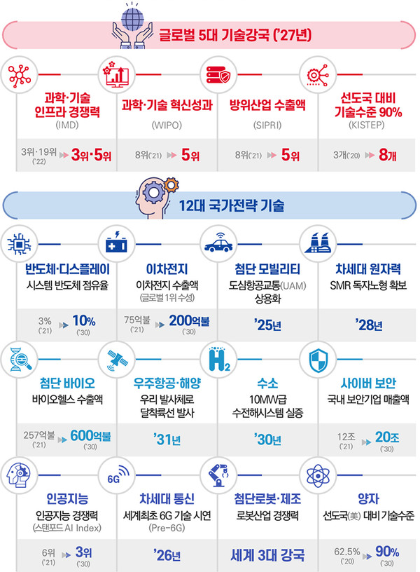이밖에도 ‘국가전략기술특별법’ 제정을 추진해 전략기술 조기확보에 필요한 R&D 우선투자, 도전적R&D 촉진, 우수인력 양성, 산학연거점·국제협력 등 전방위 지원책을 강화할 방침이다.