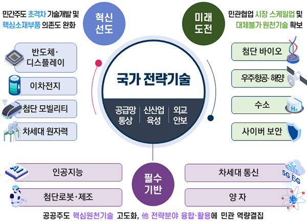 특히 우리나라가 더 이상 추격자가 아닌 기술패권 경쟁 흐름을 선도해 가는 기술강국으로의 위상을 강화하기 위한 범정부 합동 전략이다.