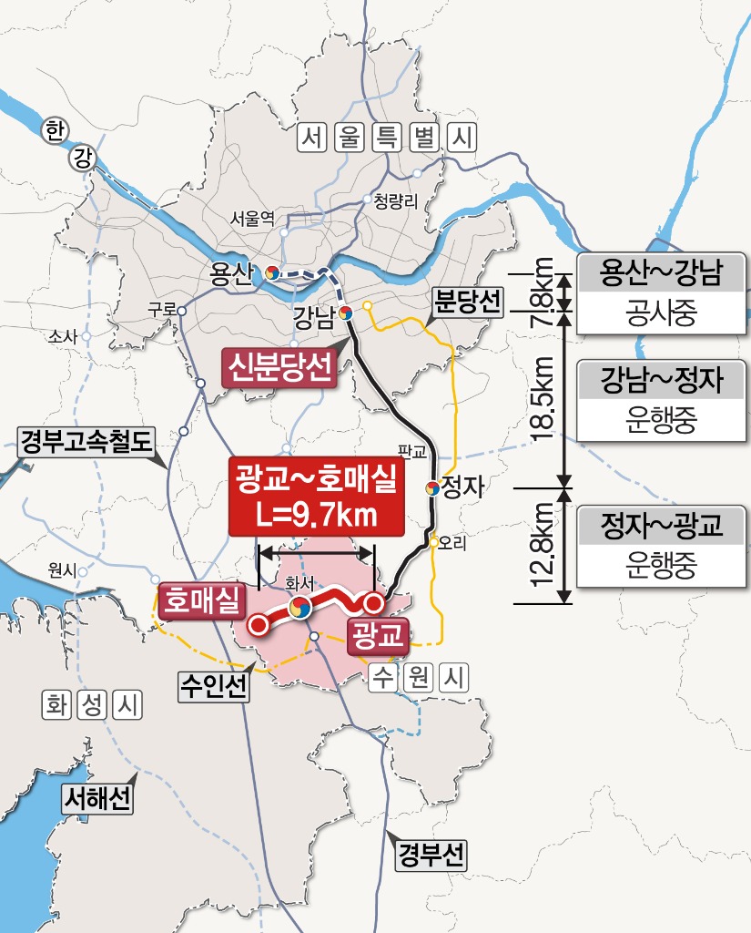 ‘03년 신분당선 정자∼수원 사업이 예비타당성조사를 통과하였으나 정자∼광교 구간만 우선 추진되고, 남은 구간인 광교∼호매실은 경제성 부족 등을 이유로 사업 추진이 계속 지연되어 왔다.