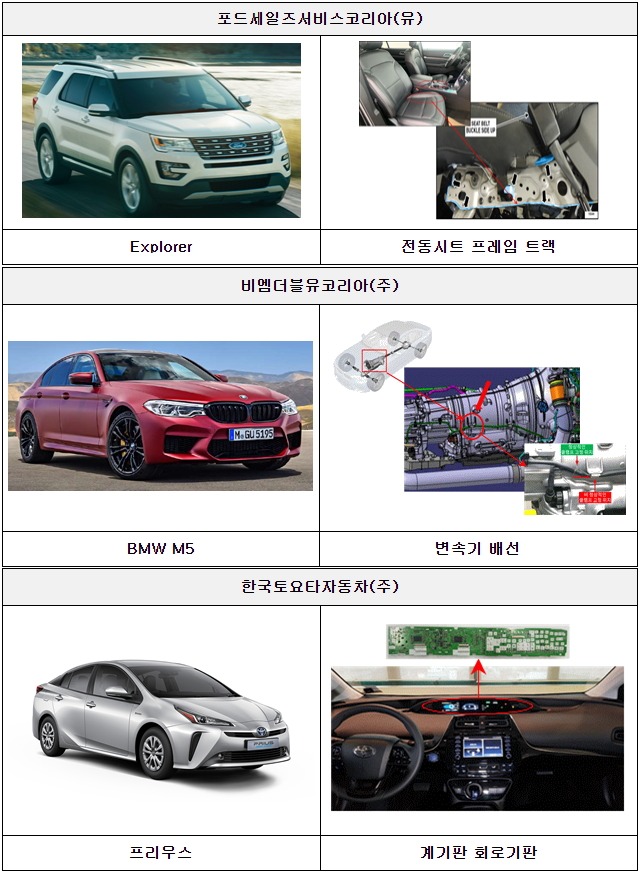 둘째, 비엠더블유코리아㈜에서 수입, 판매(판매이전 포함)한 BMW M5 등 2개 차종 171대는 변속기 연결 배선의 설치 위치 및 고정이 불량하여 변속기에서 발생하는 열에 의해 연결 배선이 녹고 이로 인해 단락이 발생하여 주행이 불가할 가능성이 확인되어 시정조치(리콜)에 들어간다.