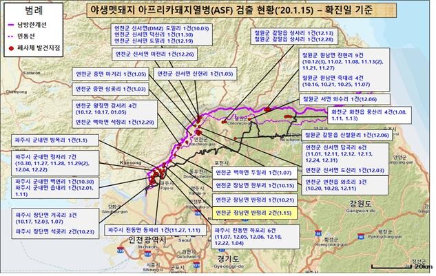 국립환경과학원은 1월 15일 폐사체에서 아프리카돼지열병 바이러스 확진결과를 관계기관에 통보했다. 이로써 연천군에서 총 28건의 아프리카돼지열병이 확진됐으며, 전국적으로는 74건이 됐다.