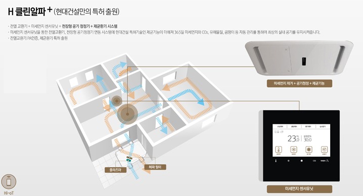현대건설이 개발한 H 클린알파 플러스는 상업·의료·복합시설 등에 적용되어 장비 성능개선 및 에너지 절약 효과가 입증된 공기조화기의 광플라즈마 기능을 세계최초로 공동주택용 환기장비 및 천장형 공기청정기에 접목해 개발한 것이다.