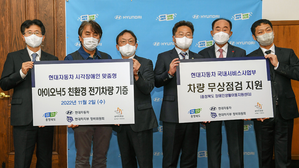 현대자동차는 2일(수) 충청북도청에서 충청북도 이우종 행정부지사, 현대자동차 국내서비스사업부 이태수 상무, 금속노조 현대자동차지부 정비위원회 권오환 의장, 충북사회복지공동모금회 노영수 회장, 충북장애인생활이동지원센터 이동일 센터장, 이지무브 김익훈 대표이사 등 주요 관계자들이 참석한 가운데 ‘시각장애인 맞춤형 차량 기증식’을 진행했다.