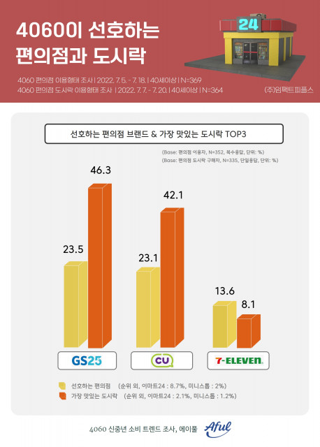 임팩트피플스는 에이풀(Aful)을 통해 2022년 7월 5일~18일까지 40세 이상 남녀 369명을 대상으로 편의점 이용 트렌드와 7월 7일~20일까지 40세 이상 남녀 364명을 대상으로 편의점 도시락 이용 트렌드 조사를 실시했다.