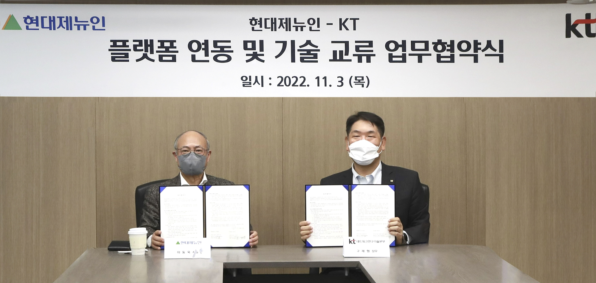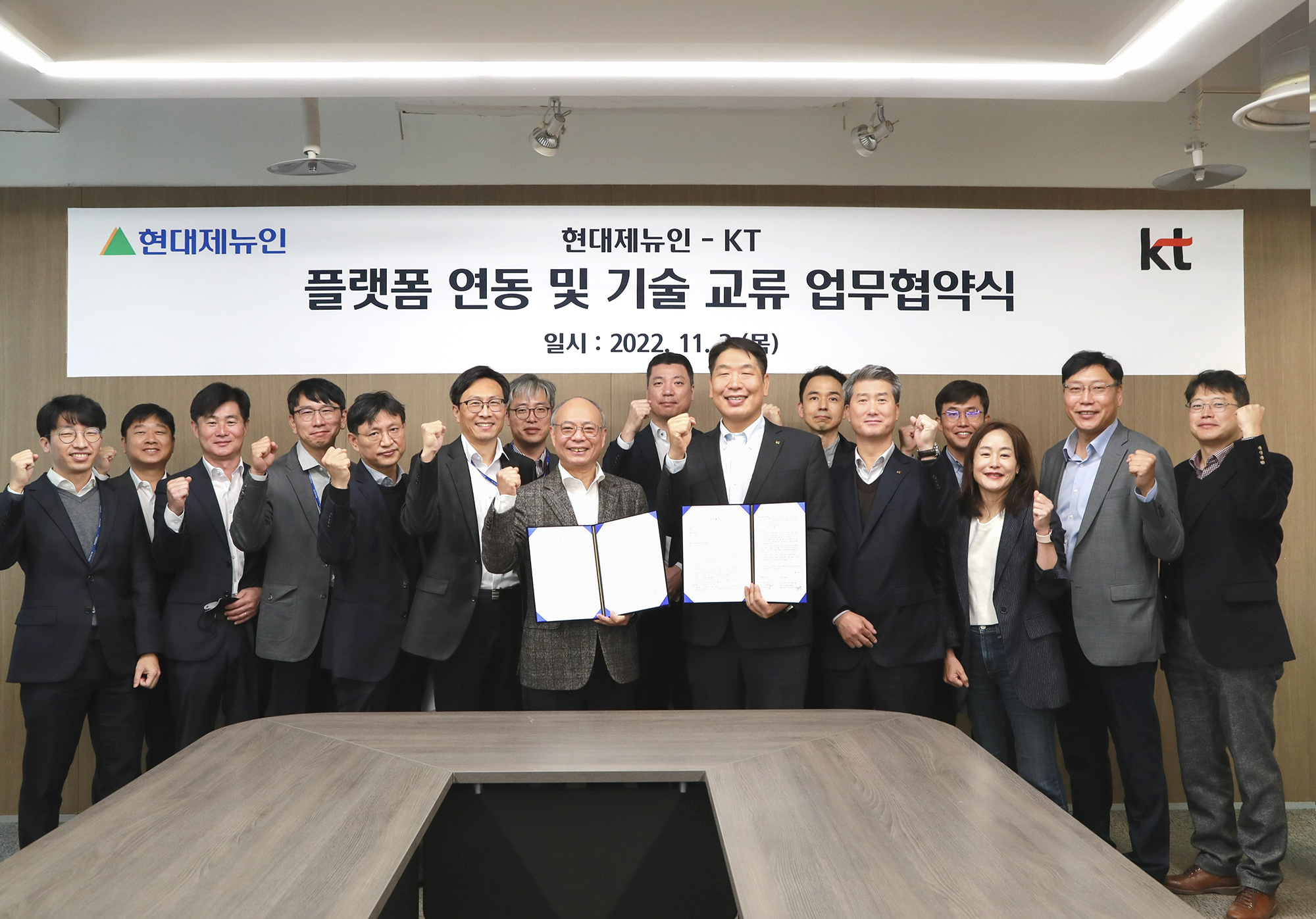 KT가 3일 현대건설기계 분당 사무소에서 현대제뉴인과 ‘상호 플랫폼 연동 및 기술 협력’에 관한 업무협약(MOU)을 체결했다고 4일 밝혔다.