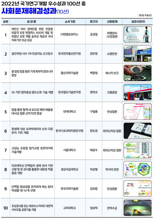 한편 이번 선정에는 국가연구개발사업으로 창출한 우수성과의 국민 체감도를 높이기 위해 ‘사회문제를 해결하는 연구개발성과’ 선정 과정에 일반 국민이 직접 참여하는 온라인 투표 절차를 반영했다.