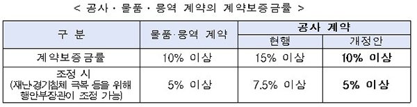 이와 함께 공사계약의 계약보증금률을 기존 15% 이상에서 10% 이상으로 하향조정하는 방안도 마련한다.