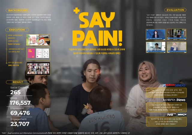 ‘SAY PAIN!’ 캠페인은 아픔을 참지 말라는 슬로건으로, 인도네시아 발달장애인이 질병 증상을 제대로 표현하고 치료받을 수 있는 환경 구축에 기여하기 위해 인도네시아에서 진행한 사회공헌 캠페인이다. 국내에서 2019년부터 발달장애인, 경계성 지능 아동 등 느린학습자 대상 증상표현 교육사업 ‘참지마요’를 진행한 대웅제약은 글로벌 ESG 경영 실천의 일환으로 올해 참지마요를 인도네시아로 확대했다.