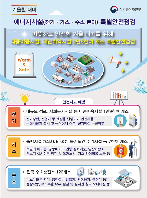 전통시장을 포함한 대규모 점포, 사회복지시설 등 다중이용시설 1만9000여 호와 가스보일러를 사용하는 숙박시설 7000여 호, 전국 수소충전소 111곳을 대상으로 안전점검을 실시한다. 특히 각 분야별로 겨울철에 유의해야 할 안전사고 취약부분을 집중 점검한다.