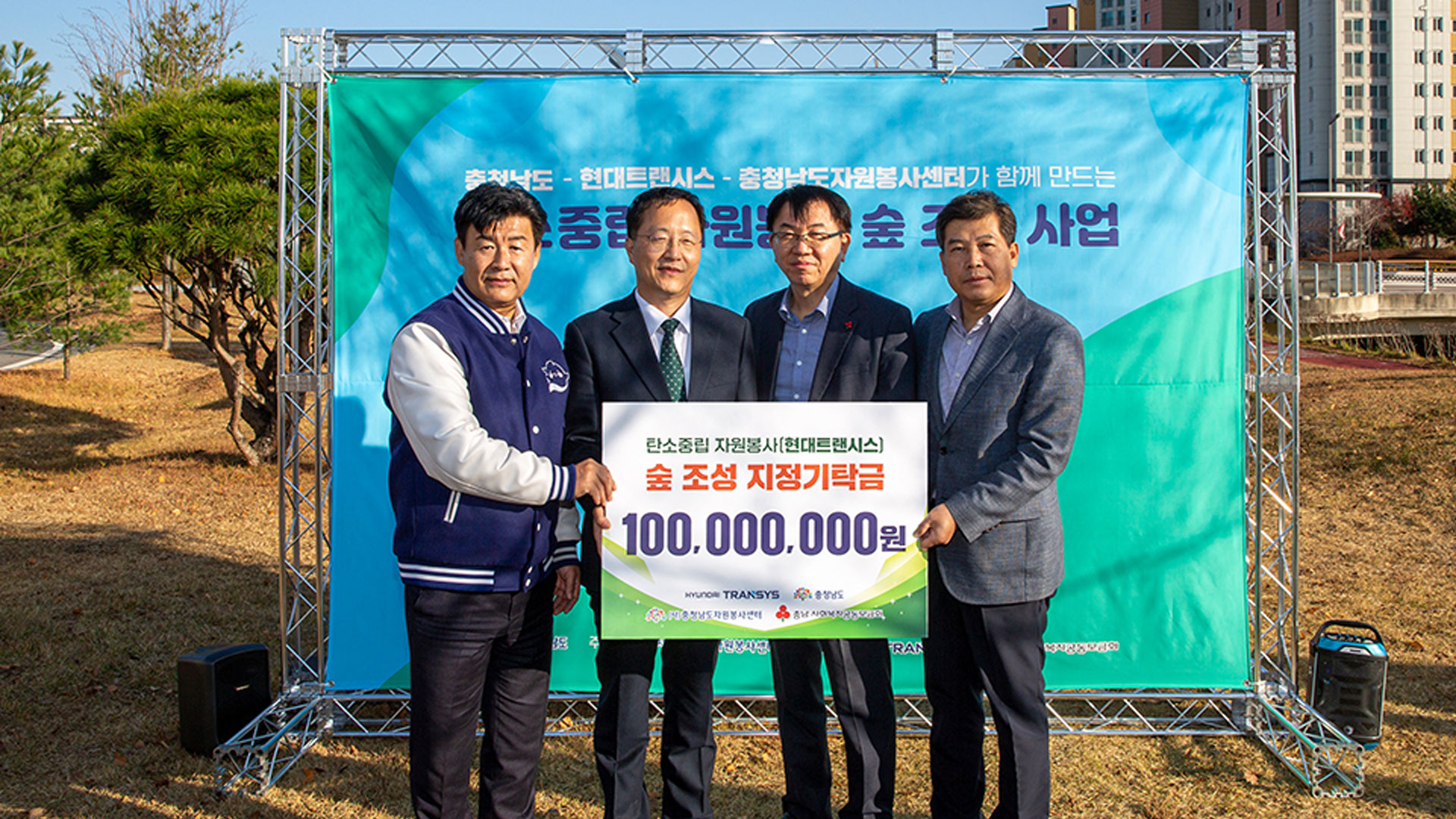 현대트랜시스는 지난 11월 16일 충남 홍성군 홍예공원에서 충청남도, 충청남도자원봉사센터와 함께 탄소중립 숲 조성을 위한 업무협약을 체결하고 기념 식수, 표지석 제막식 행사를 진행했다.