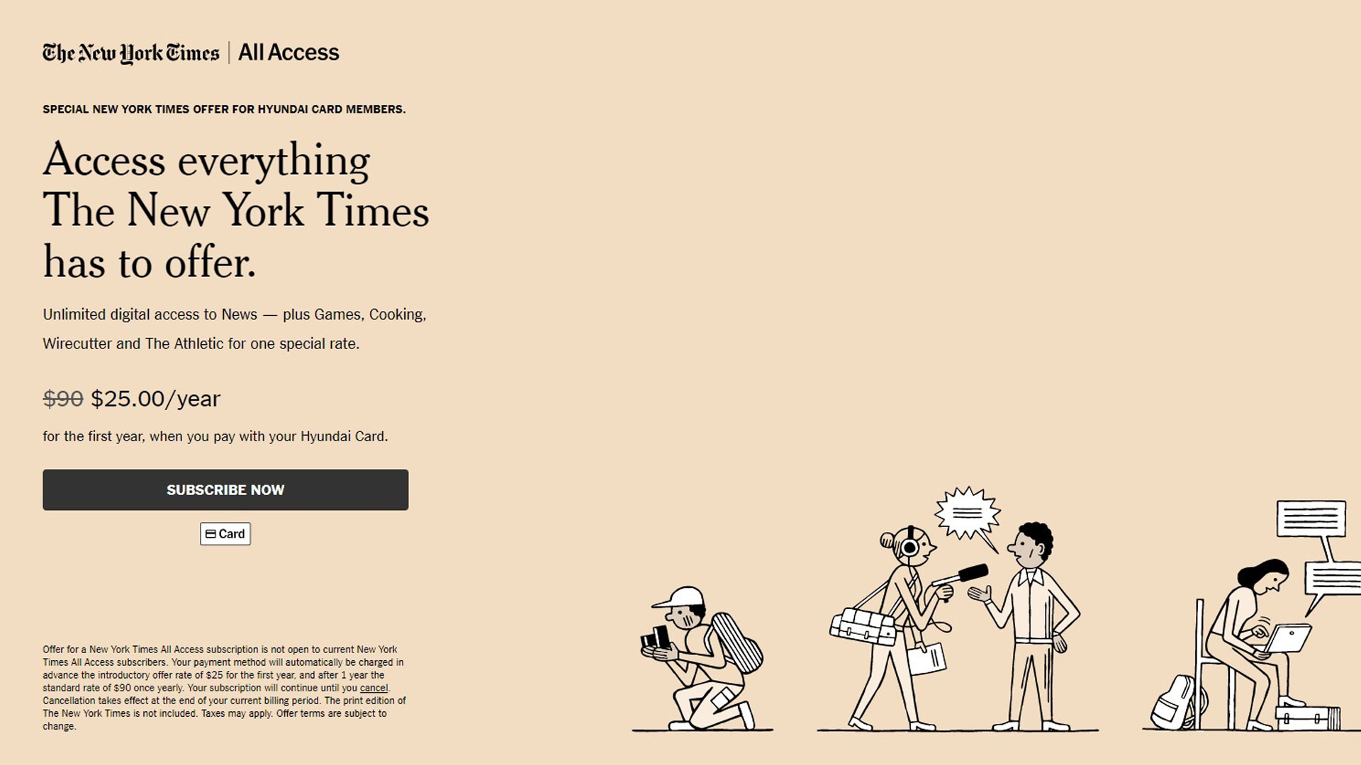 연간 이용료는 30달러로, 현대카드 고객은 25달러(약 3만3500원)에 이 상품을 즐길 수 있다. 해외 결제가 가능한 현대카드를 보유한 회원이면 누구나 이 혜택을 누릴 수 있다. 이를 위해 현대카드와 뉴욕타임스는 현대카드 회원 전용 구독 신청 페이지를 만들어 운영하기로 했다.