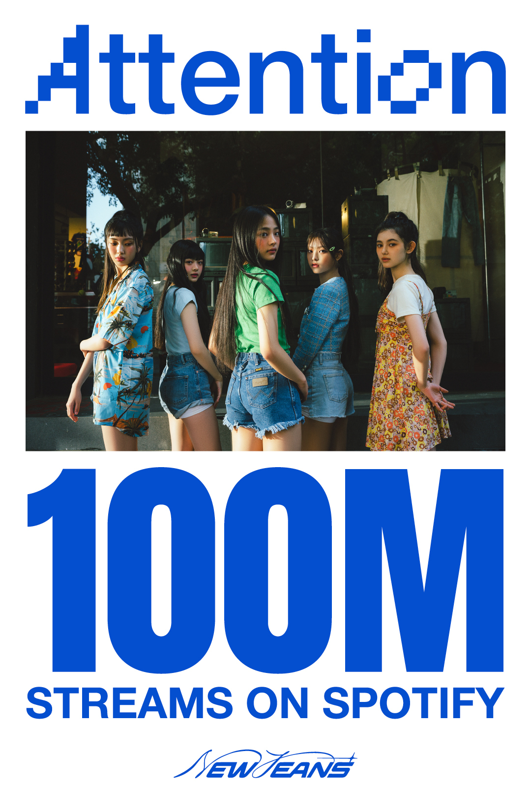 뉴진스(NewJeans)의 데뷔곡 ‘Attention’이 ‘Hype boy’에 이어 스포티파이에서 1억회 스트리밍을 달성했다.