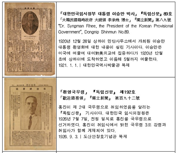 주요 전시 기록물로는 대한민국 임시정부 초대 대통령 이승만 박사를 소개한 독립신문 89호(1921년), 2대 국무령 홍진 선생을 소개한 독립신문 192호(1926년), 김구 주석의 취임 선서(1944년) 등이 있다.