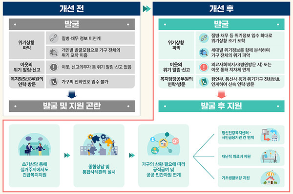 또 위기가구 발굴 시 질병과 채무 정보 등을 추가로 연계해 사각지대 발굴 대상자 선정의 정확도를 제고하고, 주요 위기정보 입수는 기존 34종에서 44종으로 확대한다.