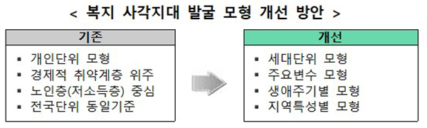 정부가 복지 사각지대에 놓인 위기가구를 보다 정확히 찾기 위해 기존 ‘개인단위 모형’에서 ‘세대단위 모형’으로 개선하는 등 발굴 모형을 다양화한다.