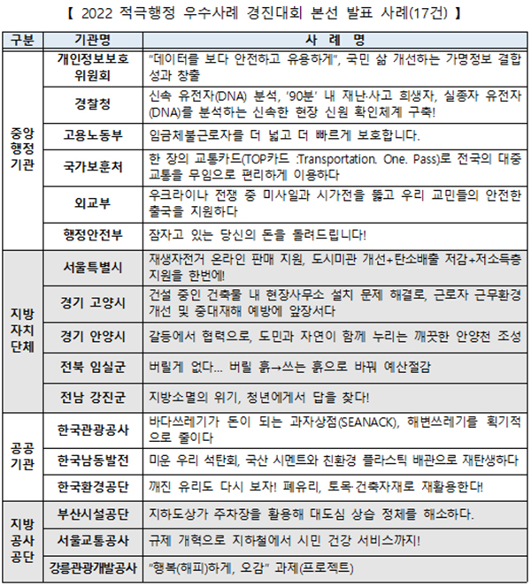 코로나19 이후 2년 만에 대면 행사로 치러진 본선에서는 17건의 본선 사례 중 기관 6곳이 대상을, 11곳이 최우수상을 수상하게 된다.