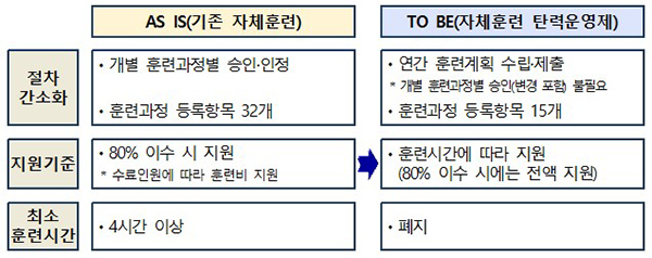 ‘자체훈련 탄력운영제’를 도입해 우수훈련 기업이 직업훈련을 직접 실시하는 자체훈련의 경우 기업은 연간 훈련계획만 제출하면 별도의 승인 절차 없이도 정부로부터 훈련비를 지원받을 수 있다.