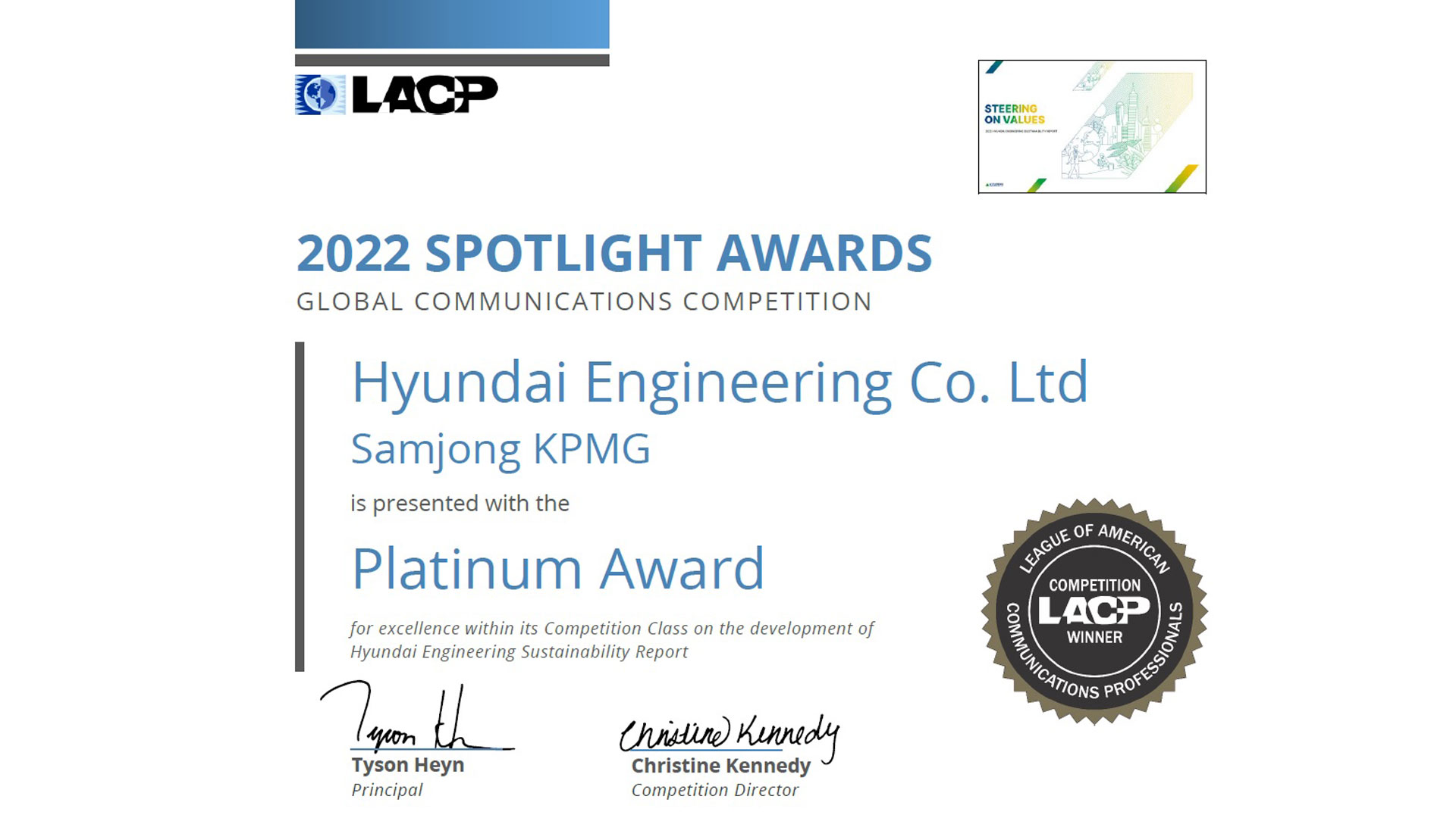 세계적 권위의 마케팅 조사 기관인 LACP는 미국 커뮤니케이션 전문가들이 설립한 글로벌 커뮤니케이션 전문기관으로, 매년 전 세계 각 국 기업 및 단체 등에서 발간한 지속가능경영보고서, 연차보고서 등을 평가해 시상하고 있다.
