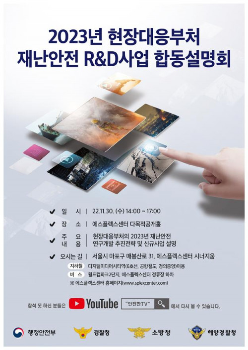 이와 관련해 행안부는 재난 및 안전사고를 직접 현장에서 대응하는 4개 부처와 합동으로 오는 30일 서울 에스플렉스센터에서 ‘2023년 현장대응부처 재난안전 연구개발사업 합동설명회’를 개최한다고 29일 밝혔다.