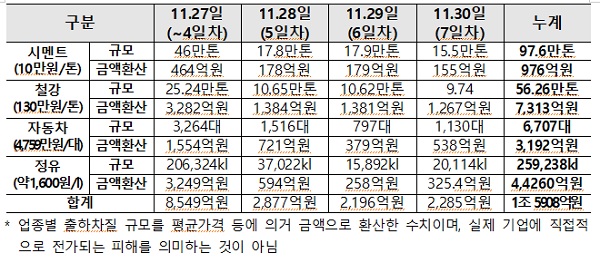 업종별로 살펴보면 철강업계의 출하 차질 규모가 56만2600톤·7313억원으로 가장 크다. 정유(4426억원), 자동차(3192억원), 시멘트(976억원) 등도 시간이 갈수록 피해가 커지고 있다. 산업부는 업종별 출하차질 규모를 평균가격 등에 따라 금액으로 환산한 수치이며, 실제 기업에 직접적으로 전가되는 피해를 의미하는 것은 아니다고 밝혔다.