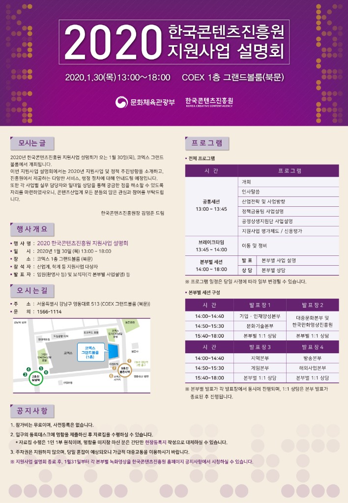 문화체육관광부(이하 문체부)와 한국콘텐츠진흥원(이하 콘진원)은 오는 30일(목) 13시 서울 코엑스 그랜드볼룸에서 ‘2020 한국콘텐츠진흥원 지원사업 설명회(이하 지원사업 설명회)’를 개최한다.