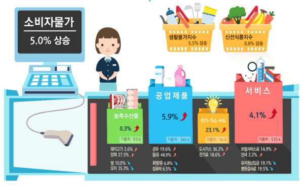 개인서비스(+6.2%), 공업제품(+5.9%), 전기·가스·수도(+23.1%), 농축수산물(+0.3%) 가격이 모두 올랐다.