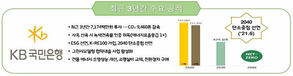 국민은행은 2020년 신사옥 신축 때 ‘건축물 에너지효율 1+ 등급’을 취득했으며 기존 건축물의 에너지 성능 개선을 위한 ‘그린 리모델링 협약대출 사업’도 추진하고 있다.