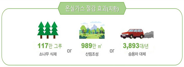 해당 온실가스 감축량을 치환분석해 보면 소나무 117만 그루 식재효과(강원지역 30년산 기준), 989만㎡의 산림조성 효과, 3893대의 승용차가 1년 동안 배출하는 온실가스와 맞먹는 배출량에 해당하는 것으로 파악됐다고 국토부는 설명했다.