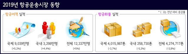 국토교통부는 ’19년 항공여객이 지난해 대비 5% 증가한 1억 2,337만 명으로 역대 최고치(연 단위)를 기록했다고 밝혔다