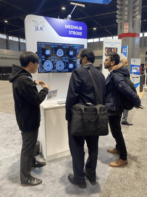 뇌졸중 분야의 인공지능 대표 기업인 제이엘케이의 부스에도 미국을 비롯한 독일, 태국 등 여러 국가의 의료진 및 관련 업계 담당자들이 방문했다. 제이엘케이는 인공지능 기반 뇌졸중 전 주기 토털솔루션 ‘메디허브 스트로크(MEDIHUB STROKE)’를 소개했다. RSNA에 참여한 뇌 영상 관련 인공지능 회사들이 주로 CT와 관련된 솔루션을 선보인 데 반해, MRI와 CT 모두 적용 가능한 종합 솔루션이라는 점에서 ‘메디허브 스트로크’가 눈길을 끌었다. 네덜란드에서 방문한 영상의학과 전문의는 메디허브 스트로크에 대해 “CT에서 뇌경색과 뇌출혈을 동시에 탐지할 수 있어 응급상황 진료에 큰 도움이 될 것”이라 평했다.