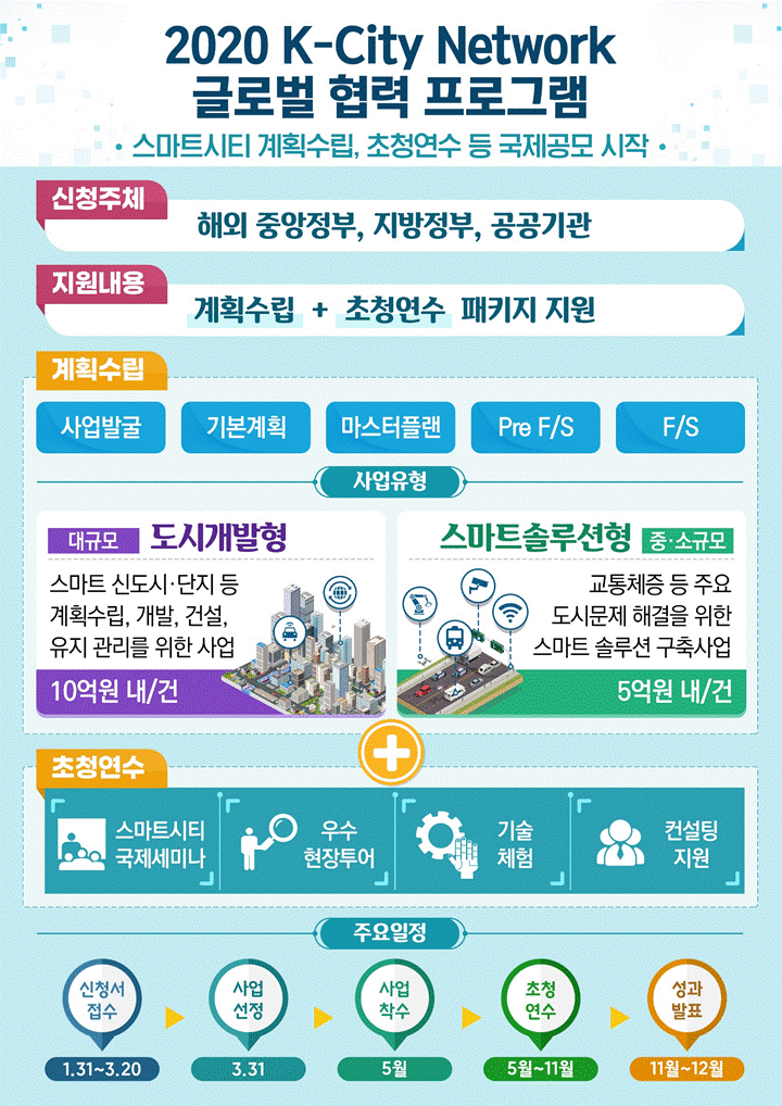 「K-City Network」 글로벌 협력사업으로 선정될 경우 한국정부가 해당국의 스마트시티 사업계획을 수립하고 초청 연수를 패키지로 지원하게 된다.