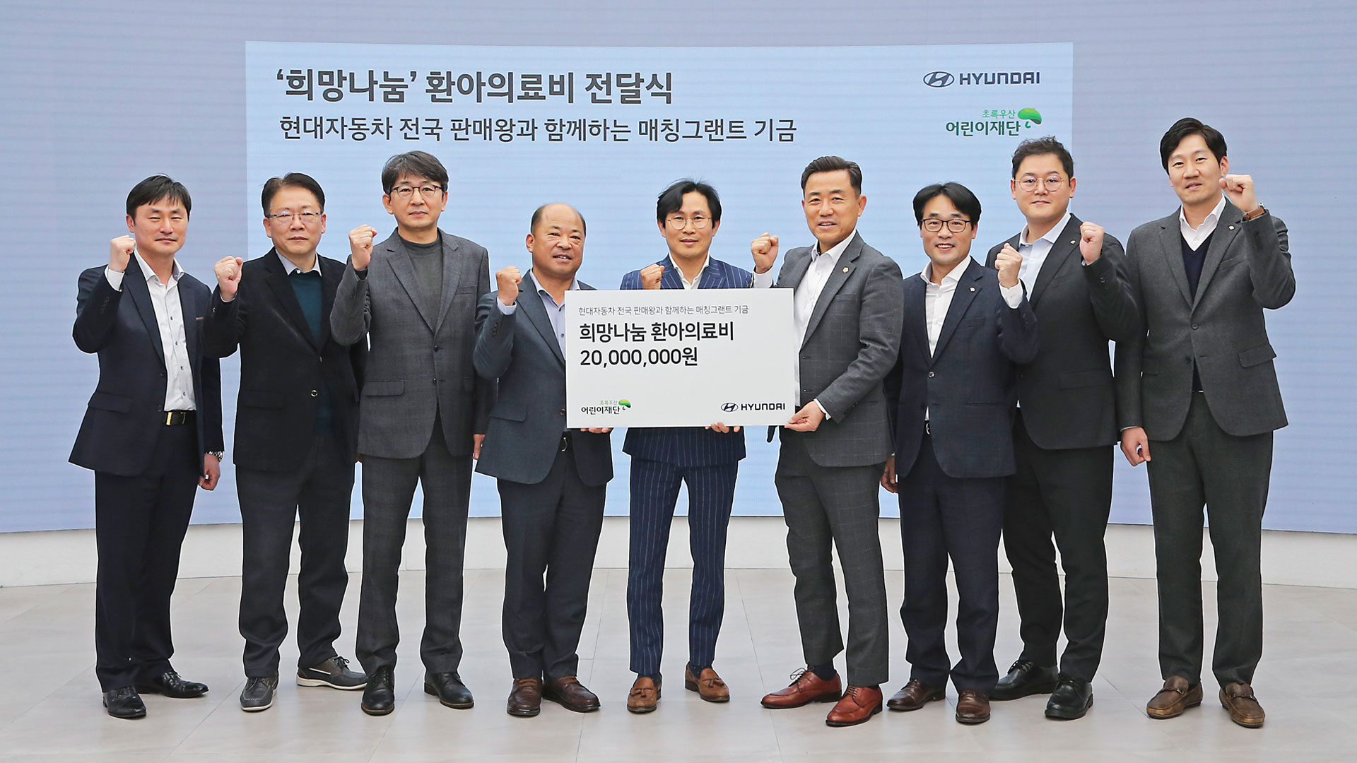 현대자동차가 역대 판매왕 등 전국 판매 우수 카마스터들과 함께 저소득층 환아들을 돕기 위한 후원금을 조성하고, 초록우산어린이재단에 전달했다.