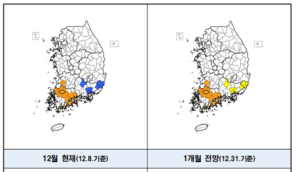 특히 내년 2월까지 강수량이 평년과 비슷하거나 적을 것으로 예상돼 남부지방 가뭄은 이어질 것으로 우려된다.
