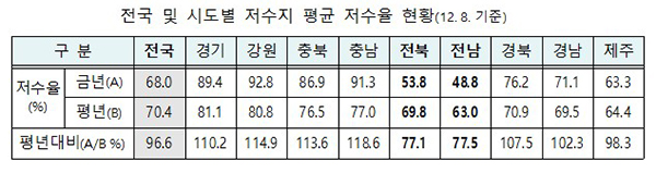 또 농업용 저수지의 전국 평균 저수율은 평년의 96.6%로 대부분 정상이나, 강수량이 적은 전남·북의 저수율은 평년의 77% 수준이다.