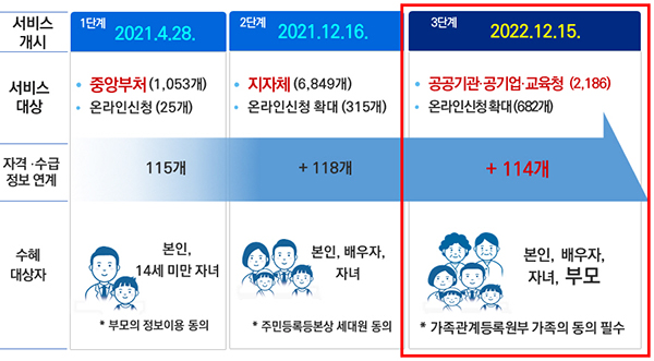 특히 3단계 시행과 함께 교육·직장 등으로 다른 지역에 사는 가족이라도 본인 동의만 있으면 가족 중 한 사람이 혜택을 확인할 수 있는 서비스도 시행한다.