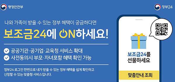 이상민 행안부 장관은 “보조금24를 통해 정부 혜택을 알아보는데 소요되는 불필요한 시간과 불편을 줄이고 보다 똑똑하게 혜택을 챙겨드릴 수 있게 됐다”면서 “앞으로도 디지털플랫폼정부를 통해 여느 선진국보다 앞선 행정서비스를 제공하겠다”고 밝혔다.
