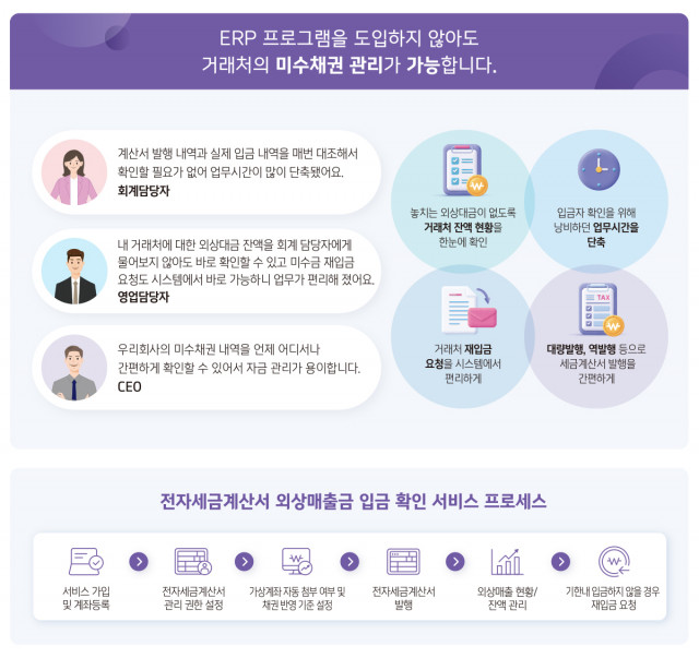 외상매출채권 간편 조회 기능도 제공한다. 대시보드를 통해 매출 및 수금 현황을 한눈에 볼 수 있어 기업의 경영 관리 및 회계·자금 관리가 용이해진다. 또한 입금 요청서 전송 기능이 있어 미수금 처리 과정을 신속하게 지원한다.