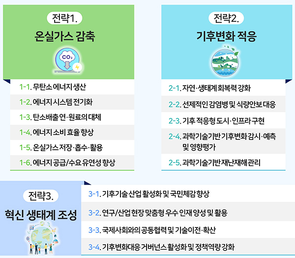 주요 추진 전략은 자연·생태계 회복력 강화, 감염병 및 식량안보 대응, 기후적응형 도시·인프라 구현, 과학기술 기반 기후변화 감시·예측 및 영향평가, 과학기술기반 재난재해 관리다.