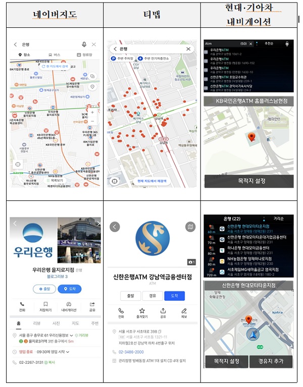 금융위원회는 기존 금융맵 ‘금융대동여지도’에서 제공하는 금융권 ATM·지점 위치정보를 16일부터 네이버지도, 티맵, 현대·기아차 내비게이션 등 국내 주요 지도플랫폼에서도 조회할 수 있게 된다고 15일 밝혔다.
